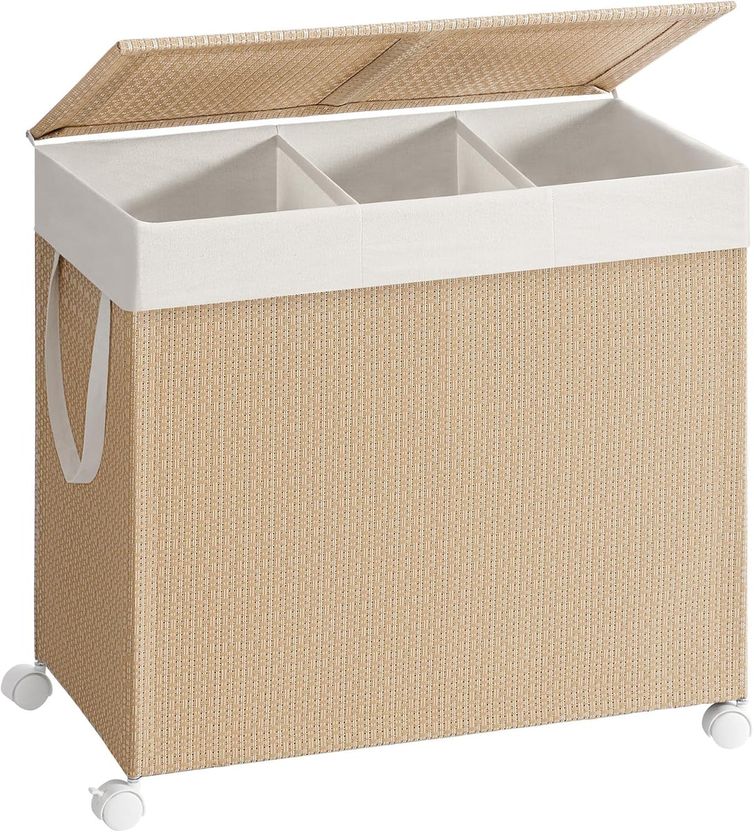 SONGMICS HOME Koš na prádlo 3 přihrádky, 140 l třídič prádla na kolečkách s víkem, pytel na prádlo s rukojeťmi, ratanový vzhled, do prádelny, koupelna, přírodní béžová, matná bílá