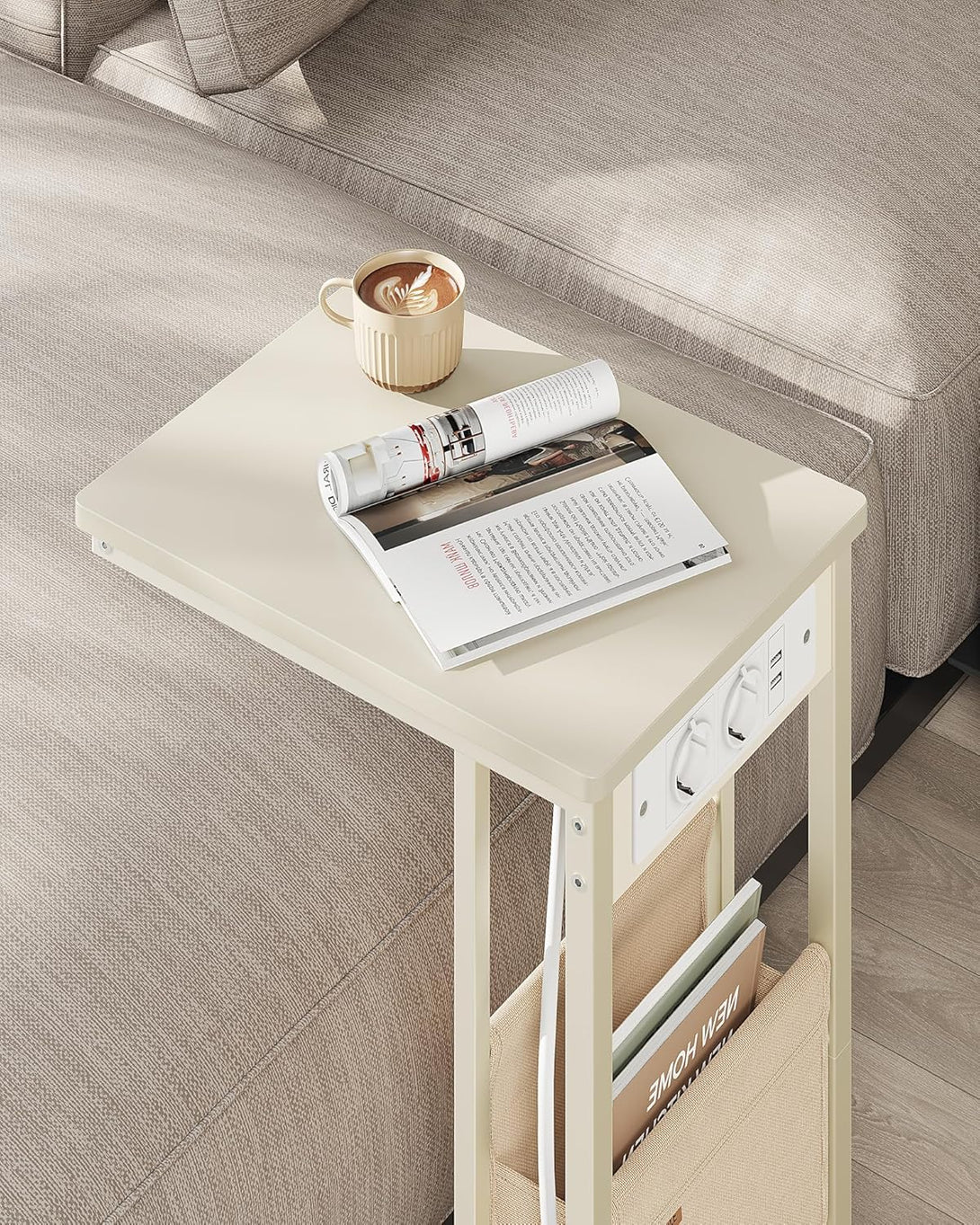 Odkládací stolek, noční stolek se zásuvkami, tvar C, konferenční stolek do malých prostor, 2 USB porty, 2 AC zásuvky, úložný vak, nastavitelné nohy, krémově bílá